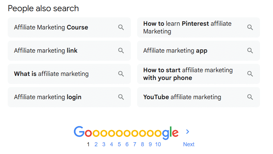 Search your main keyword (in incognito mode), then scroll to the bottom of the results page. You’ll find a list of suggested searches.