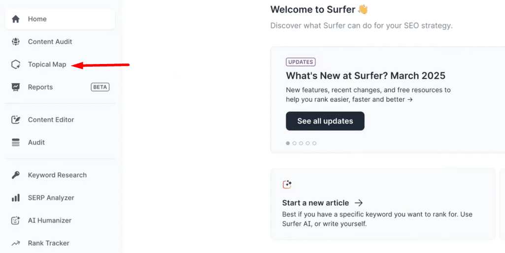 For example, in Surfer SEO, you can use the Topical Map to identify what content you need to create—then generate multiple drafts in just a few clicks.