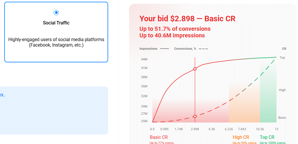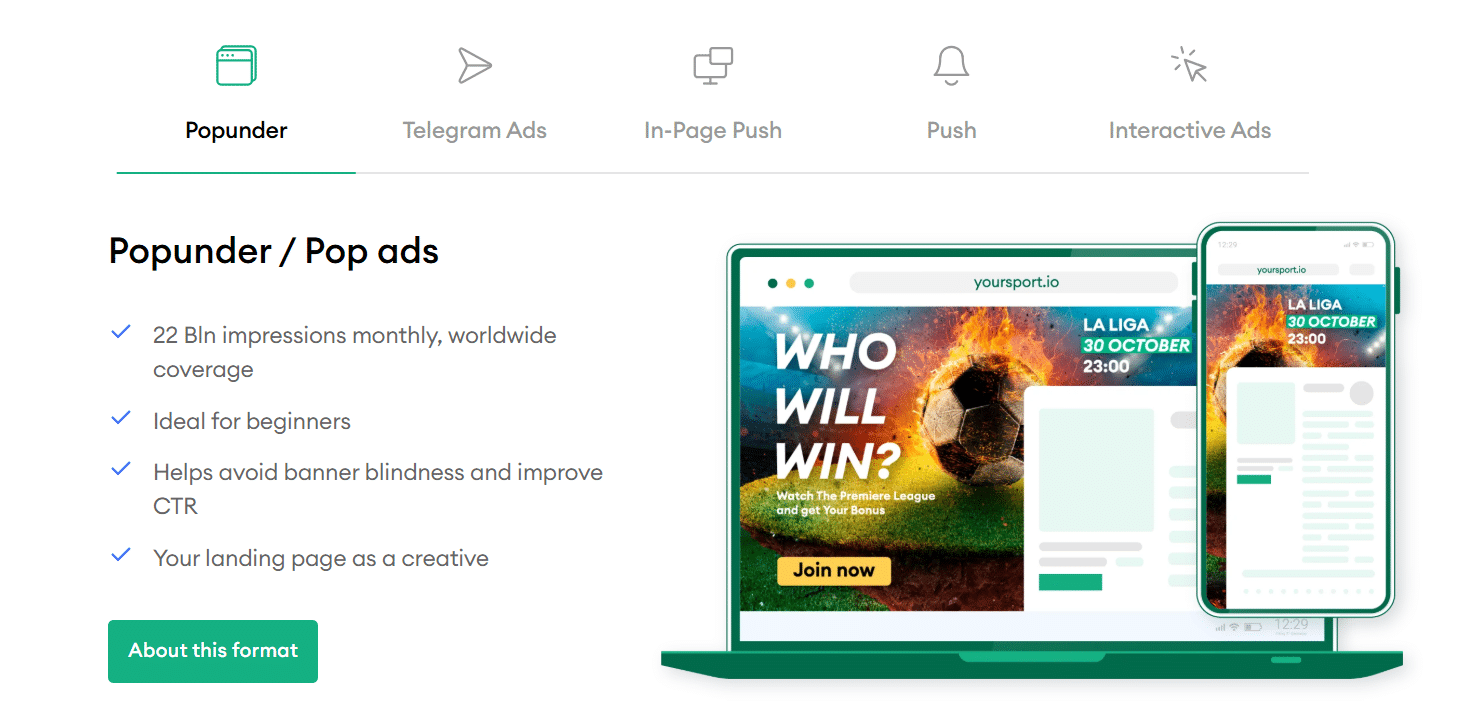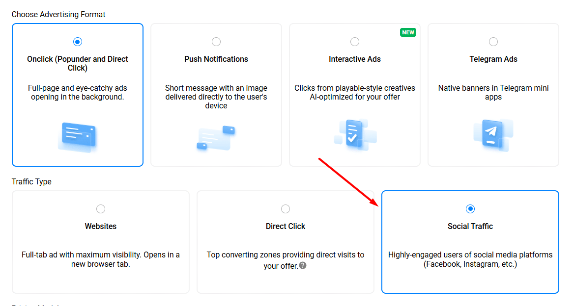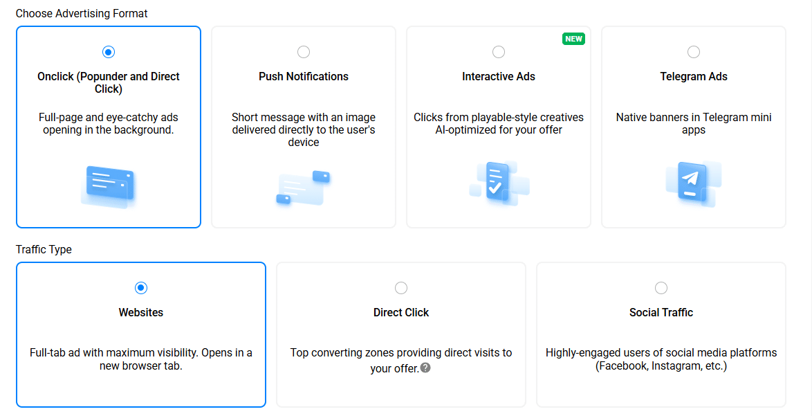 As mentioned earlier, PropellerAds offers three main types within the Onclick format: Popunder, Direct Click, and Social Traffic. Each of them differs in how the ads are delivered, as well as in pricing and traffic quality.
