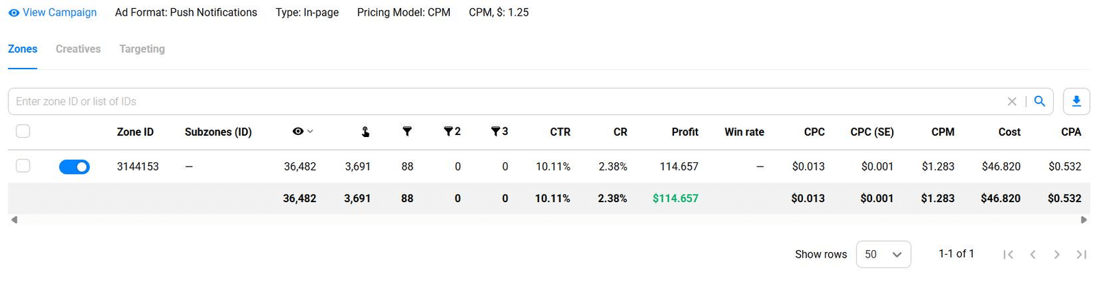 For example, I once had an In-Page Push campaign that scaled steadily to around $100/day — driven by just a single Zone ID that matched perfectly with my ad creative.