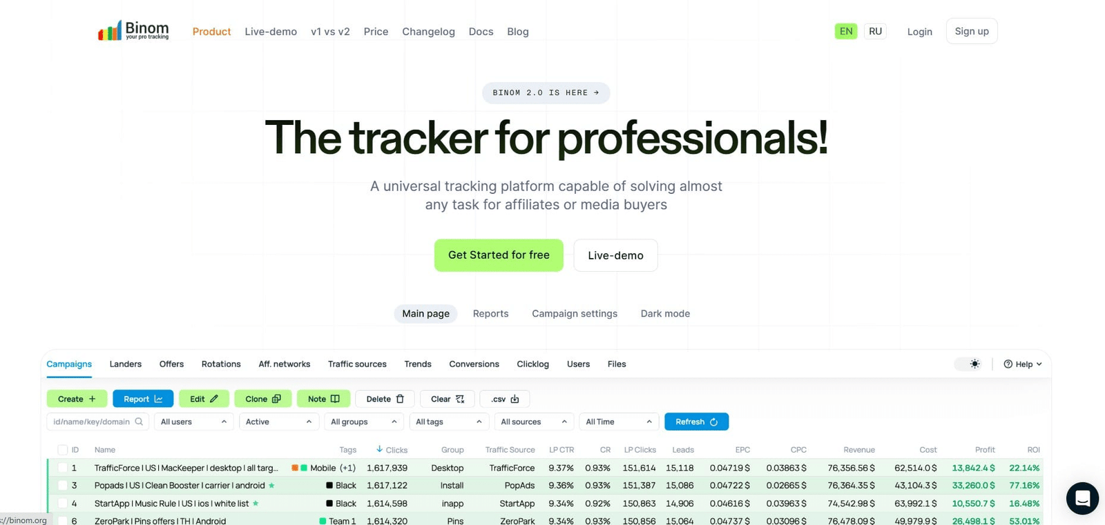 Binom is a self-hosted tracker, meaning you install it on your own VPS (private server). It’s a popular choice among professional affiliates for several reasons: