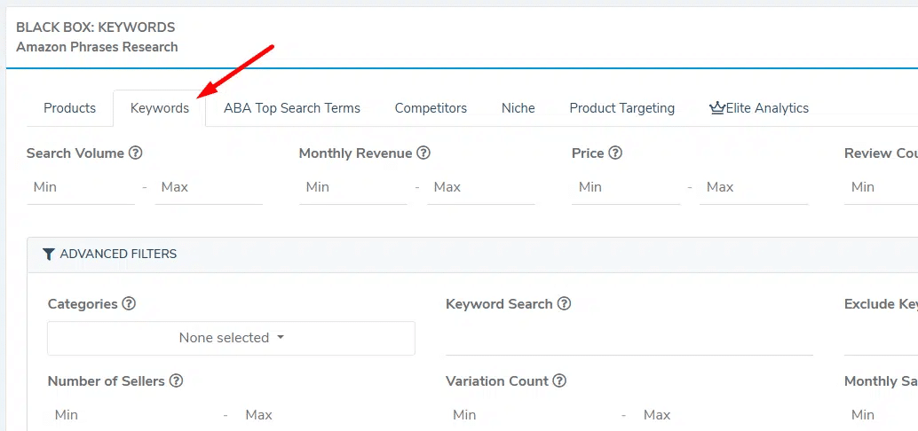 From the Helium 10 dashboard, go to Tools > Black Box > Keywords.