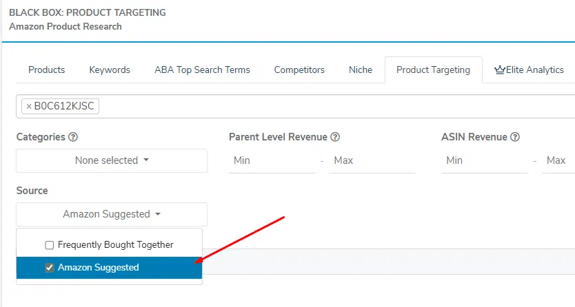Beyond co-purchase data, you can also use the “Amazon Suggested” filter to see which ASINs Amazon itself recommends you target in ads for that product.
