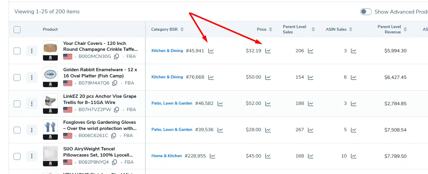 - Historical data (price, BSR, reviews — accessible via the chart icon)