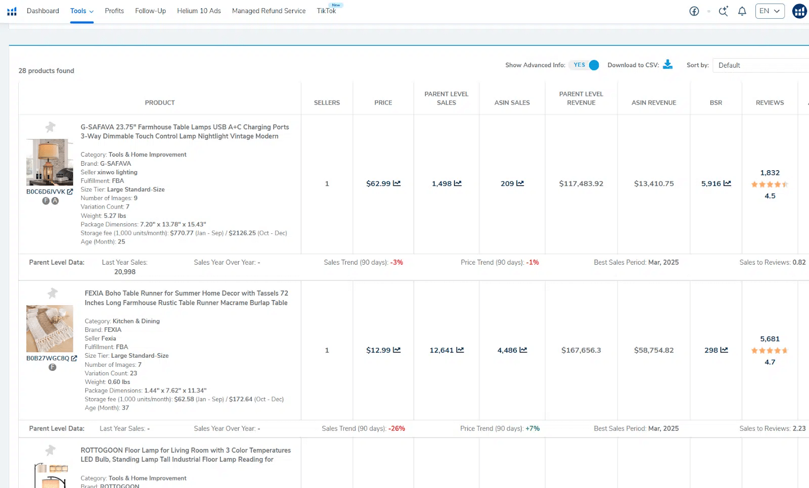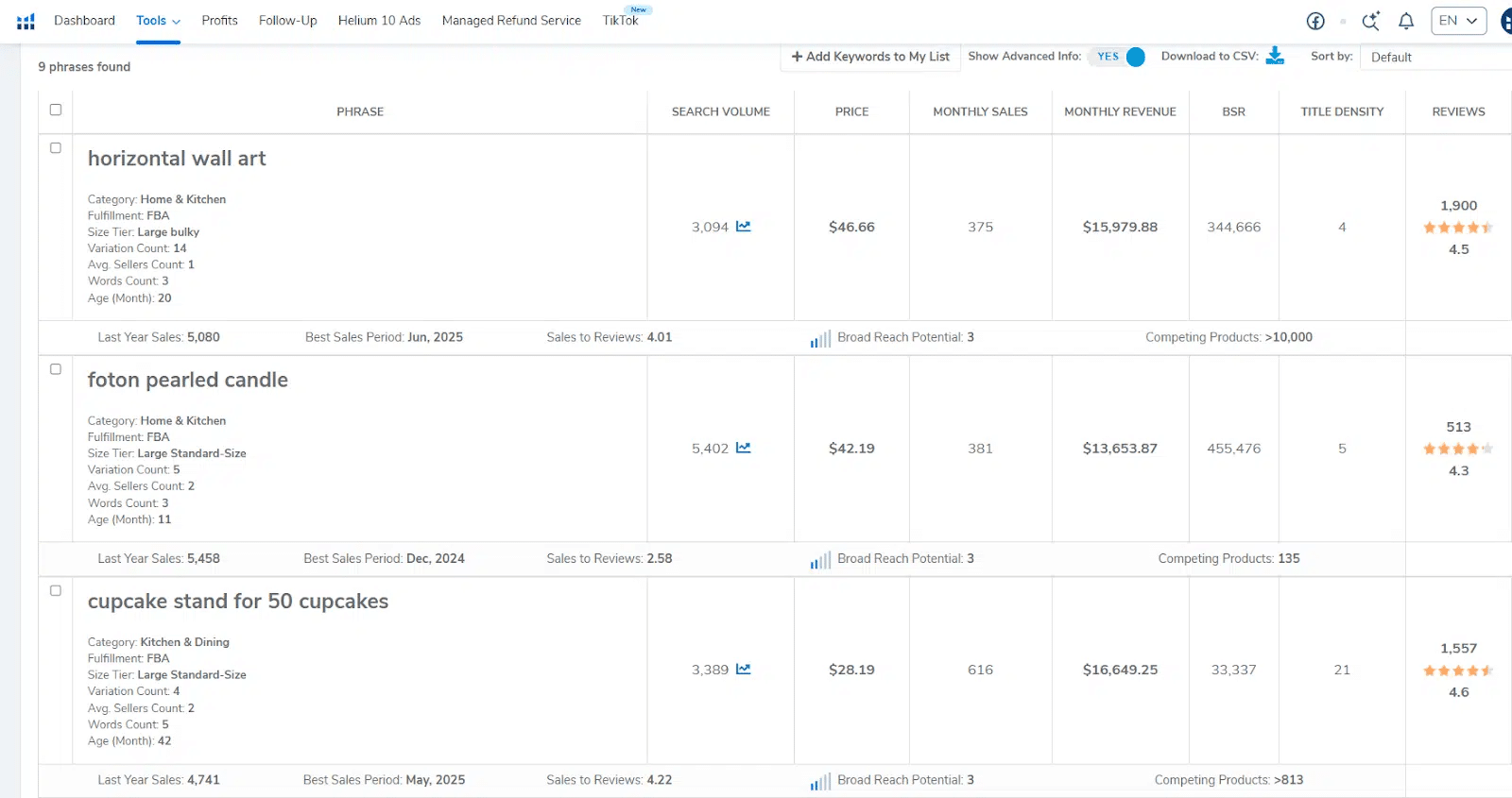 You simply enter a product keyword, and Helium 10 will return results similar to what you’d see on Amazon — but with far more advanced filtering capabilities.