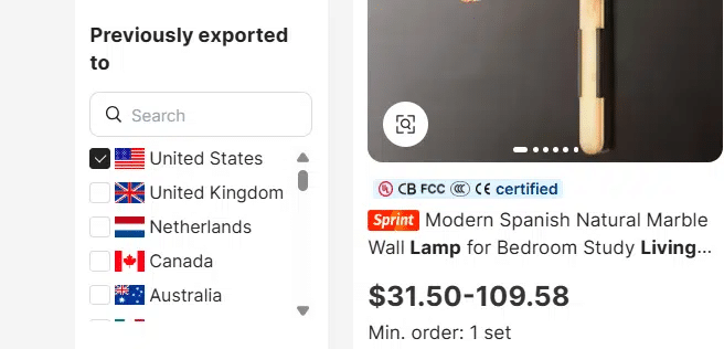 For example, if you plan to sell in the US, select “United States” under the “Previously exported to” filter.