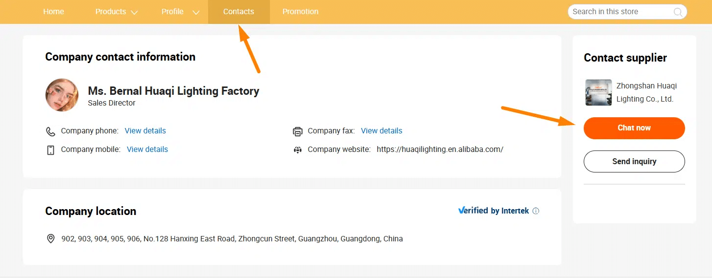 Go to the supplier’s profile page, open the “Contacts” section, and click the contact button to start a conversation.