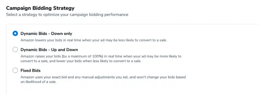 - Dynamic bid – down only: Amazon lowers your bid when conversion is less likely