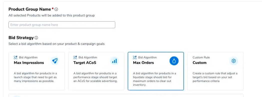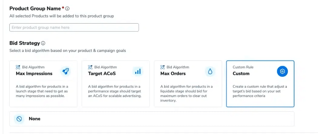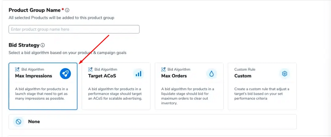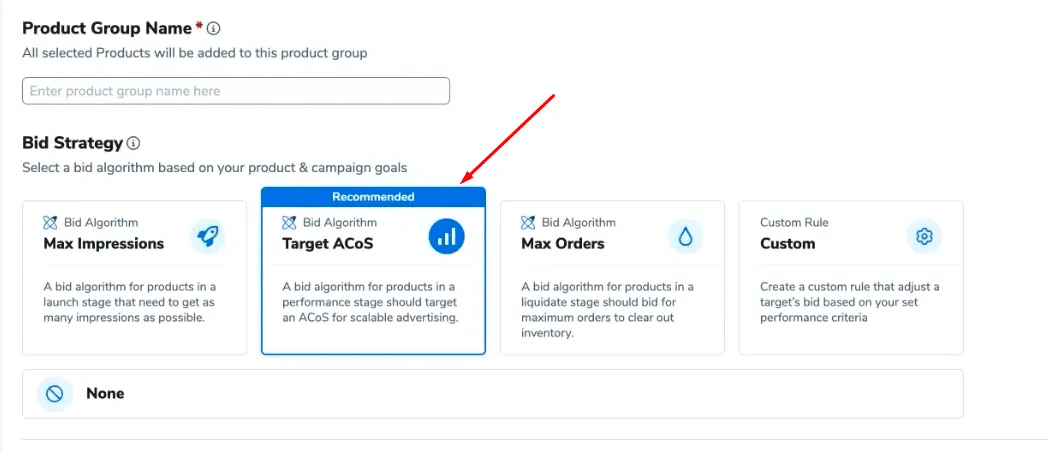 Right from the first step, you’ll need to name your product group and choose a bidding strategy, such as: