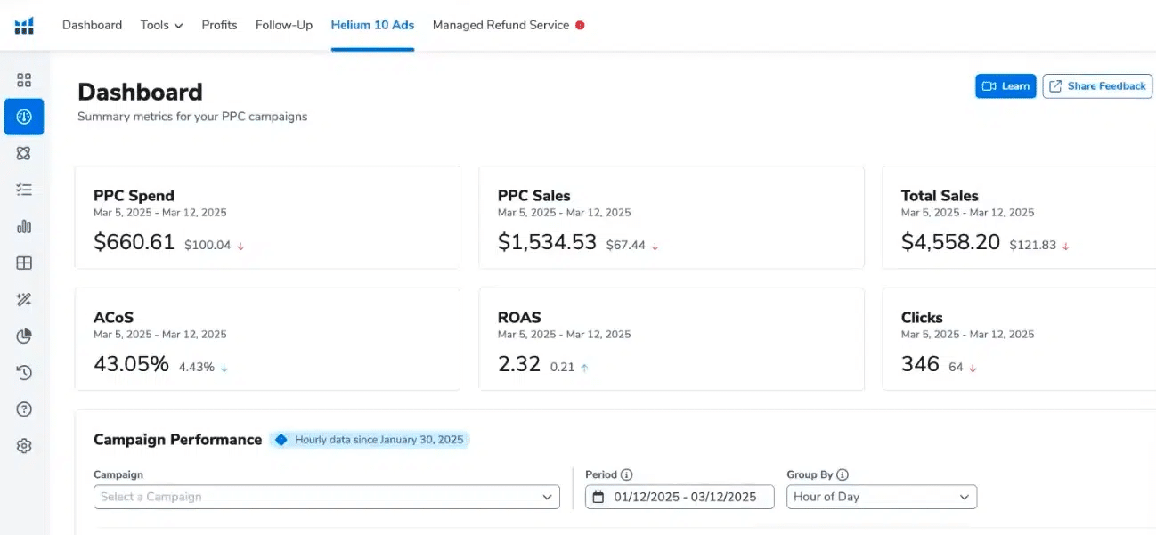 All of this is displayed clearly in a single, unified dashboard. You don’t need to jump between multiple tabs like you would in the Amazon Ad Console.