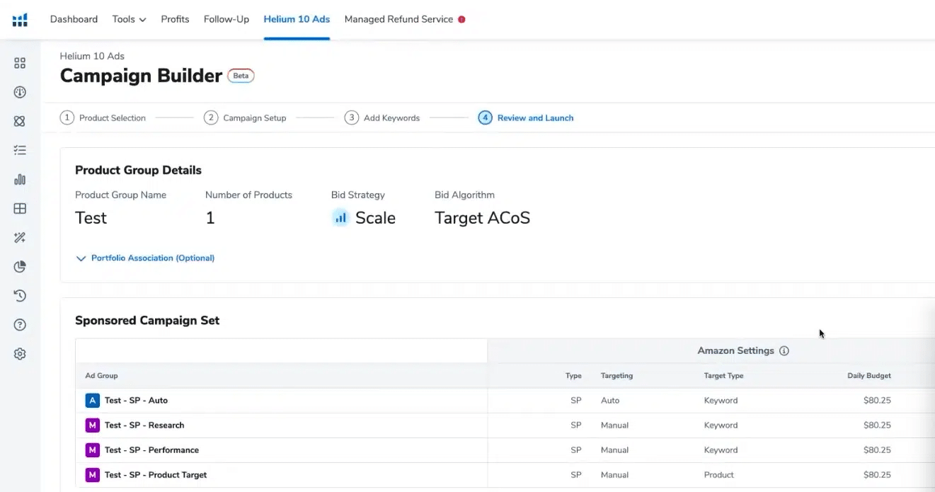 In the final step, Helium 10 Ads will show you a clear overview of your entire setup in one interface.