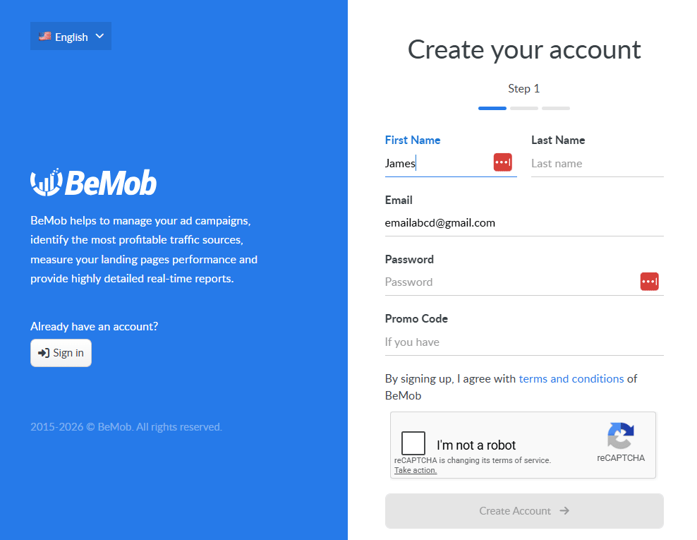 Signing up for BeMob is quick and straightforward. You can complete the whole process in just a few minutes by following these steps: