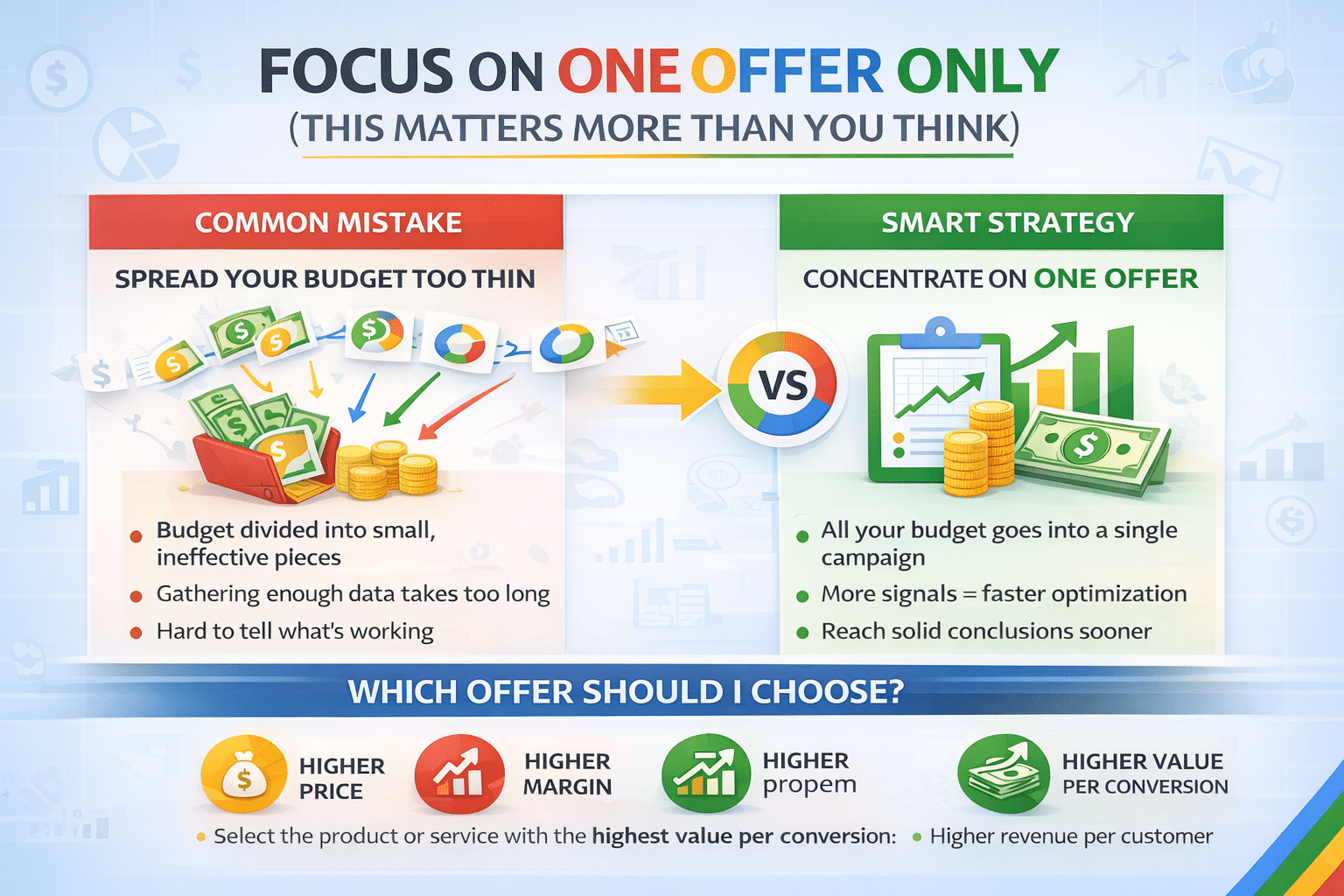 Instead of trying to do everything, you should concentrate your entire budget on a single offer.