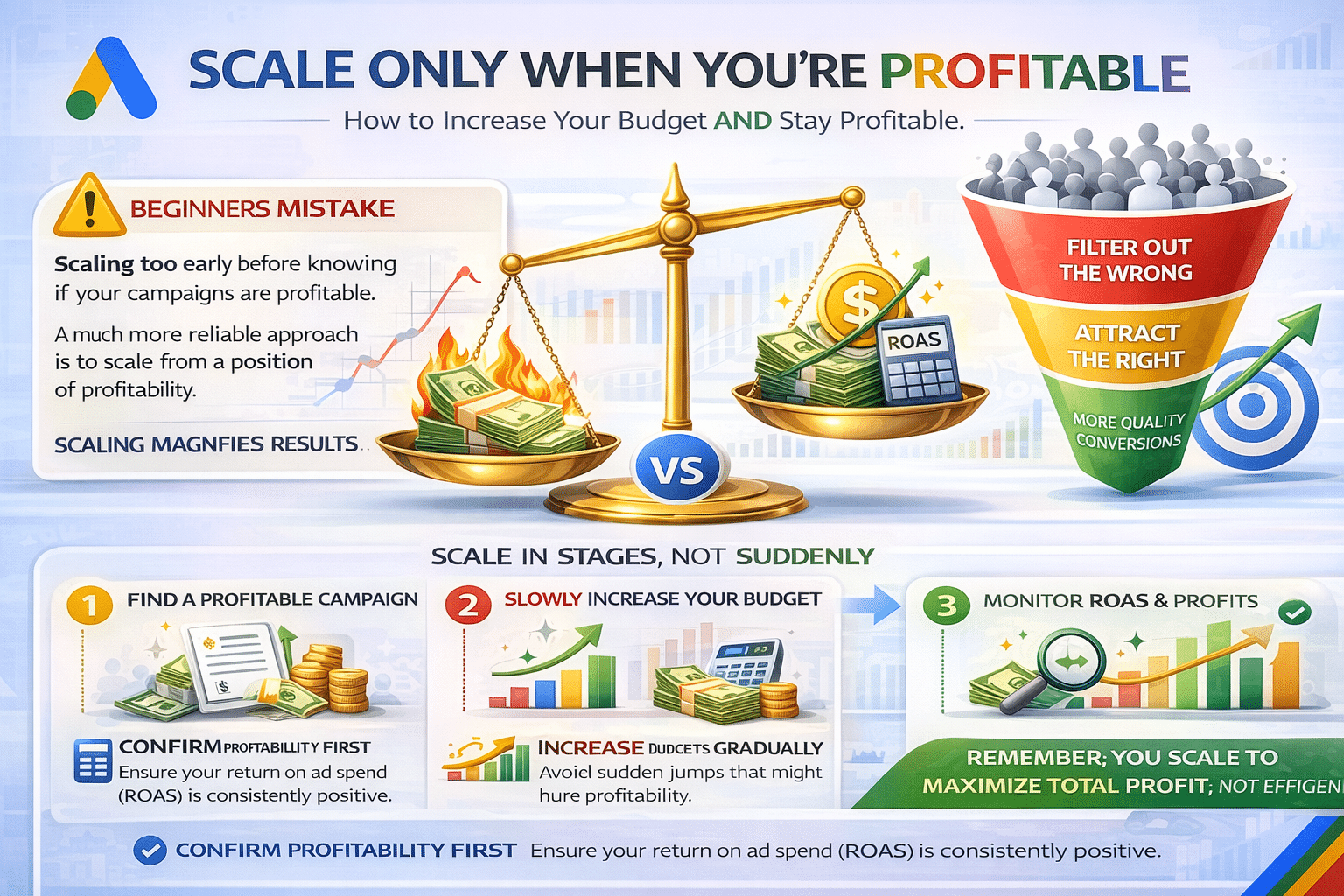 Increase budgets gradually. Monitor your key metrics. And make sure profitability stays within an acceptable range.