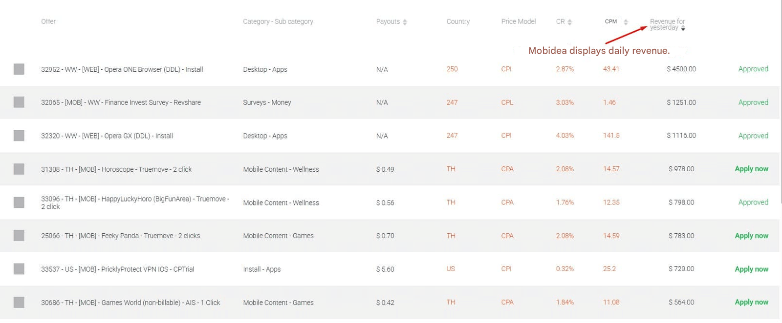 Mobidea, on the other hand, is more beginner-friendly. One of its standout features is the “yesterday stats” dashboard, where you can instantly see how much other publishers earned and which offers are trending.